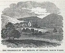 The place was as little attractive as a cottage in Wales could well be, and its closeness to the road took away even its rural feel, but it had the advantage of being no more than half a mile from Rhyllon, and had its little garden and its roses, its green turf and its pure air. These to an inhabitant of Manchester, which Jewsbury then was, were matters of health and enjoyment. There she stayed with her young sister and brothers; and there Mrs Hemans found her established on her own return from Wavertree at the end of July. From a young age, Jewsbury had had to contend with poor health, and when she arrived in Wales, she fell ill, but her health soon improved. Many of the poems in her Lays of Leisure Hours, dedicated to Mrs Hemans, "in remembrance of the summer passed in her society", were written in the cottage. Some were immediately addressed to her, particularly "To an Absent One", and the first of the series of "Poetical Portraits" in the same volume was meant to describe her. The picture of Egeria in The Three Histories, written by Jewsbury some time later, came avowedly from the same original.[13]