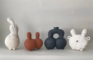 Other work explored a "words within words" motif, including (C)hair (2012)—a drawing of an antique chair constructed of hair[1]—and F(r)iction (2016)—a series of words that uses book slices to call attention to other words contained in each.[23] Her post-2020 "Mashup" series consists of protuberant ceramic figures and dense drawings in black and white. It features bulbous forms that combine design elements from disparate cultures, including Gaelic, Chinese and Native American southwest. The works appeared in her 35-year retrospective and were characterized as "provocative and inquiring" by art critic Renny Pritikin.[1]
