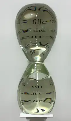 In the 1990s, Porges pursued an interest in casting and began creating objects in bronze, glass and wax.[36][37][6] In 1995 she created the sculpture Witness, an open glass book atop a steel bookstand with the word "thought" etched into a glass shelf below.[24][12] Squeeze (1993–2001), an hourglass shaped object in hot sculpted glass, explores a scientific principle called "the observer effect," distorting the text mounted on a wall behind as viewers try to read it.[1] Other cast works featured bronze relief drapery samples and oversized hands in various materials and settings that were based on fragments and gestures from art-historical paintings.[24][3]