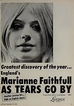 Faithfull began her singing career in 1964. Her first gigs as a folk music performer were in coffeehouses[1] and she soon began taking part in London's exploding social scene. In early 1964 she attended a Rolling Stones launch party with artist John Dunbar and met Andrew Loog Oldham, who 'discovered' her. "As Tears Go By",[14] her first single, was written and composed by Jagger, Keith Richards, and Oldham, and became a chart success. (The Rolling Stones recorded their version one year later, which was also successful.)[15] She then released a series of successful singles, including "This Little Bird", "Summer Nights", and "Come and Stay with Me".[1] Faithfull married John Dunbar on 6 May 1965 in Cambridge, with Peter Asher as the best man.[9] The couple lived in a flat at 29 Lennox Gardens in Belgravia, London SW1.[9] On 10 November 1965, she gave birth to their son, Nicholas.[9]