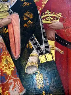 The influences of the courtly style are particularly evident in this panel. The precious fabrics, the red tapestry draped behind the throne, and the brocade robes, lined with ermine in the case of the eldest king, display various symbols of Mary, such as the letter "M" in the shoulder strap of the black-robed king, the griffins, the leaping unicorn, and the pomegranates. According to some sources, the design of the robes and the courtly scene can be traced back to the experiences of the young Conrad von Soest at the Burgundian court in Dijon, travels that cannot be verified. The courtly fashion of the time is also reflected in the old king's beaked shoes, the young king's horn worn on a ribbon ("bandelier"), Mary's plucked eyebrows, and the heavy belts.