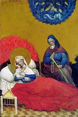 Upon closer inspection, the fiery red ring behind the bed turns out to be a cloud of angels. The singing of the blue angels high above the bed is indicated by a scroll. The similarity of the angels' faces is striking. The writing in the halos of the Mother and Child is difficult to decipher (Mary: "Sancta Maria, mater Cristi vir(go)" (Holy Mary, Mother of Christ, Virgin); Jesus: "Jesus Christ" (partly in Greek letters)). Against the golden background of the halo, the intimate eye contact between mother and child is clearly visible, emphasized by the uniformity of their brown eyes. Their mouths seem to be approaching for a kiss. Mary holds the infant Jesus tenderly in her arms with her slender hands, while the child leans gently on his mother's neck. Joseph is depicted as an old man with white hair and a beard. The rosary on his belt, a medieval accessory of Marian devotion, refers to his role in the service of Mary and her divine child. The fine hallmarks of the gold background are only partially preserved.