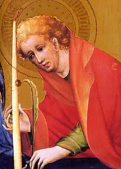 The remains of the figures on the edge imply that there were other apostle figures in the past. The word "minor" is written on the remnant of a halo below the censer. Together with the hands on the base of the book, it can be assumed that the kneeling figure of the younger James (Jacobus minor) was depicted here.
