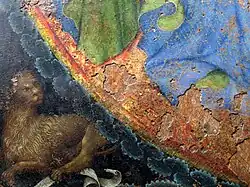 In the corners of the painting are the symbols of the four evangelists, additionally marked by a scroll. The lion for Mark and the winged man for Matthew are still visible. The bull and eagle symbols were cut off when the painting was trimmed.