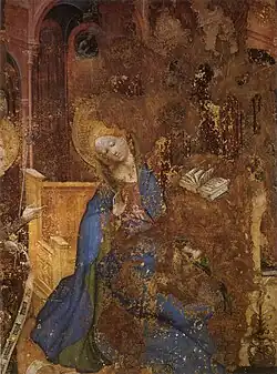 The Annunciation scene shows Mary in a church-like room. The angel carries a scroll with the inscription Ave gratia plena dominus (tecum?) (Hail (Mary), full of grace, the Lord (is with you)). Mary's tilted head indicates her decision to obey. In the lower left corner above Mary's head, in the background of the painting, the blessing figure of God can be seen, with golden rays shining towards Mary. Remnants of white feathers can be seen on the upper edge of Mary's halo, perhaps the remains of the dove that hovers over Mary as a symbol of the Holy Spirit in depictions of this scene. The word Sancta can still be seen in Mary's halo. The vase of white lilies at the right edge of the picture is a symbol of Mary's purity.