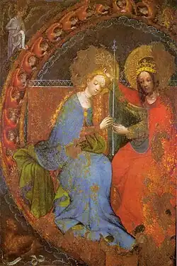 The coronation scene shows Mary in heaven, surrounded by a wreath of angels. Jesus presents her with a scepter and a crown of pearls as coronation symbols. Mary wears a cloak of the blue color of heaven with a gold clasp. Jesus is identified as King by his crown and red robe. The words ego sum can still be deciphered in Jesus' halo, perhaps with the addition of resurrectio et vita (I am the resurrection and the life).