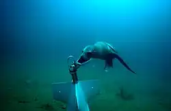 MK 6 uses dolphins and sea lions as sentries to protect harbor installations and ships against unauthorized human swimmers. MK 6 was first operationally deployed with dolphins during the Vietnam War from 1965 to 1975 and in Bahrain from 1986 to 1988.[5] When an enemy diver is detected by a dolphin, the dolphin approaches from behind and bumps a device into the back of the enemy's air tank. This device is attached to a buoy which then explodes, alerting the Navy personnel of the intruder. Sea lions carry a similar device in their mouth, but instead attach it by hand-cuffing one of the enemy's limbs. The animals depend on their superior underwater senses and swimming ability to defend against counterattacks.