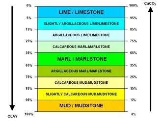 Marl or marlstone is a carbonate-rich mud or mudstone which contains variable amounts of clays and silt. The term was originally loosely applied to a variety of materials, most of which occur as loose, earthy deposits consisting chiefly of an intimate mixture of clay and calcium carbonate,[1] formed under freshwater conditions. These typically contain 35–65% clay and 65–35% carbonate.[2][3] The term is today often used to describe indurated marine deposits and lacustrine (lake) sediments which are more accurately named 'marlstone'.[4]