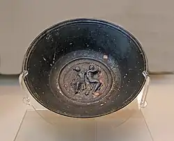 The wolf appears elsewhere in Roman art and literature in masculine form as the animal of Mars. A statue group that stood along the Appian Way showed Mars in the company of wolves.[56] At the Battle of Sentinum in 295 BCE, the appearance of the wolf of Mars (Martius lupus) was a sign that Roman victory was to come.[57]