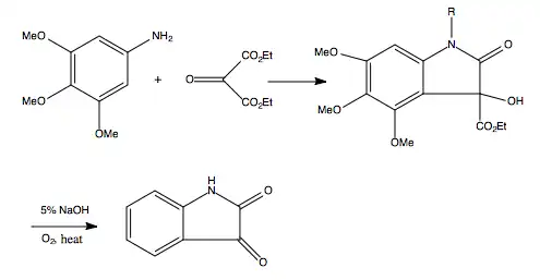 The Martinet dioxindole synthesis proceeds with an alkoxyaniline, 3,4,5-trimethoxyaniline, which reacts with an oxomalonic ester in glacial acetic acid to synthesize 2-carbethoxy-4,5,6-trimethoxyindoxyl, 2-carbethoxy-3,4,5,6-tetramethoxyindole and 4,5,6-trimethoxy-3-hydroxy-3-carbethoxyindole.[6]