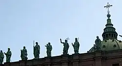 In the apse is a statue of Mary, Queen of the World, patron of the cathedral, by Sylvia Daoust. In imitation of the statues of the 12 apostles on the façade of St. Peter's, the cathedral is topped by statues of the patron saints of 13 parishes of Montreal that donated toward the cathedral, including St. John the Baptist and St. Patrick. The statues were sculpted by Olindo Gratton between 1892 and 1898 and include: