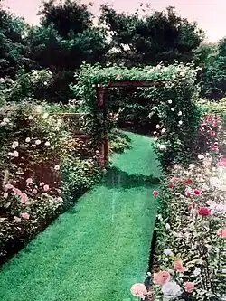 Her affection for gardens and public parks was evident in her charitable contributions and causes she supported. The garden at her home was large and well-kept. She commissioned landscape architect Herbert J. Kellaway to design the layout. Harriett Risley Foote, celebrated rosarian, selected the roses and supervised their planting. In 1924, the American Rose Society honored her rose garden with a visit during their annual meeting. In addition, she encouraged a home garden program for local school children. She donated to the Arnold Arboretum in Boston and she was one of the few patrons allowed to drive through the park. Frothingham Park, a memorial to her husband's baseball career as Captain at Harvard, was dedicated on September 27, 1930. The YMCA and Oliver Ames High School utilized the park for sporting events until the 1980s, it is still used as the home field for the Oliver Ames baseball team today. There stands a playground for young children, a baseball field surrounded by a track and tennis courts.[11][12][13]