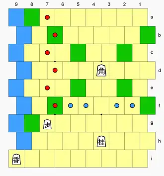All normal shogi rules apply, including initial setup (see diagram), drops, promotion, and so on. The pieces, however, have specially defined moves.