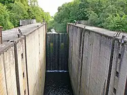 These categories dictated the power systems used to drive the mechanisms of the gates, the need for side pounds (groups 2 and 3 only) to reduce water consumption when lockaging, and the type of lock gate used.[22] Those extant gates show that they were constructed of steel;[19] three different gate designs were employed—double mitre gates, vertically-lifting gates, and flat-folding gates. Operation was primarily electromechanical via a chain drive and rack and pinion gear (mitre gates) or a counterweighted drum motor system (vertical gates). The locks had the ability to be manually operated if necessary.[23]