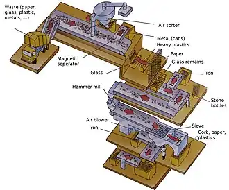 Waste enters a MRF when it is dumped onto the tipping floor by the collection trucks. The materials are then scooped up and placed onto conveyor belts, which transports it to the pre-sorting area. Here, human workers remove some items that are not recyclable, which will either be sent to a landfill or an incinerator.[11] Between 5 and 45% of "dirty" MRF material is recovered. Potential hazards are also removed, such as lithium batteries, propane tanks, and aerosol cans, which can create fires. Materials like plastic bags and hoses, which can entangle the recycling equipment, are also removed.[11] From there, materials are transported via another conveyer belt to the disk screen, which separates wide and flat materials like flattened cardboard boxes from items like cans, jars, paper, and bottles. Flattened boxes ride across the disk screen to the other side, while all other materials fall below, where paper is separated from the waste stream with a blower. The stream of cardboard and paper is overseen by more human workers, who ensure no plastic, metal, or glass is present.[11] Newer MRFs or retrofitted ones may use industrial robots instead of humans for pre-sorting and for quality control.[11] However, complete removal of human labor from the sortation process is unlikely for the foreseeable future, as one needs to replicate the dexterity of the human hand and nervous system for removing every type of contaminant within a material stream. The technical limitations of this involve advanced concepts in mechatronics and computer science, where a robot hand would need to be designed, and a highly flexible algorithm that creates another precise movement algorithm within the time constraints of the system (say, the highly approximate estimate of 30,000 lines of code to do this on a modern processor would trigger too long of a delay to be effective on a sortation line). In other words, one would need to search an encyclopedia of said robotic hand motions for every configuration of waste for every pick, and this may be computationally insurmountable, even with quantum computing, as every conditional would need to be checked every iteration.