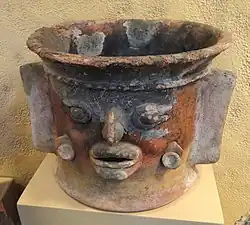 Ceramics played a big role in society during the Maya Classic Period, when the Maya elite used ceramics not only to give gifts to foreign dignitaries, but they were also used in feasts during the Classic Period. Specialized pottery was made for the graves of nobles. Not anyone could make this pottery as it was very important they knew about the Maya history, mythology, and more. On these ceramics, intricate scenes were depicted which showed the palace life of the elite. The decorative scenes needed to feature the elite because they were the primary customers and wanted to have artwork that featured themselves.[3] On each ceramic piece near the rim, its contents would be listed out, a type of beverage for a vase or food for a plate, then who it belonged to was written next. The rim also may feature Saurian head labels which may indicate a specific location where the piece was made or where the scene on the piece took place.[24] Since these ceramics were traded and gifted, many end up in differing environments. In Teotihuacan, many ceramics from Tikal have been found due to being traded between traveling merchants between different cities in Mesoamerica.[33] Specialists mainly pay attention to the writing, drawings, and hieroglyphs, since they were different for the different people and cultures they were made by.[34] As for the everyday use more simple ware was made, generally of only one color, and would be produced in large quantities for the general public use.[35] Maya pottery only weakly correlates to socio-economic levels of Maya society because of the value the culture emphasized ceramics. Rituals were where the Maya registered status rather than in pottery.[36]