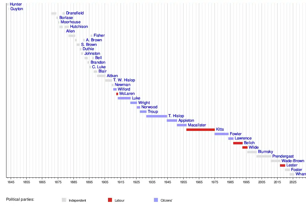 Since then the office of mayor has been held by 37 people. Five people have been mayor on two separate occasions, and the longest-serving mayor was Sir Frank Kitts, from 1956 to 1974. Tory Whanau, elected in 2022, is the first Māori person to serve as mayor.[2]