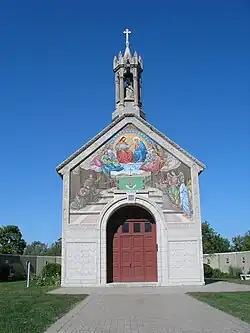 After Francis Peabody's death, his family did not wish to reside at the estate, and on March 28, 1924, the estate was sold to the Franciscan Order for a total of $450,000.[4] Beginning in 1925, the Franciscans used Mayslake Hall as a retreat house. After Peabody's death, the Portiuncula Chapel, a replica of the Chapel of St. Francis of Assisi in Assisi, Italy, was added to the property in memory of him. Completed in 1926, the chapel was one of the first replicas of the original chapel in the United States. The Portiuncula Chapel at the Franciscan Monastery of the Holy Land in America in Washington, D.C. was also built around the same time. Originally, the chapel was located at the site of Peabody's death.[3] It was moved to its present location near the mansion in 1973. Behind the chapel, a semi-circular memorial wall surrounding a flower and herb garden, was constructed by the Franciscan Order of Friars Minor.