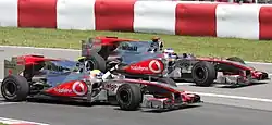 The McLaren MP4-25 is a Formula One racing car designed and raced by McLaren in the 2010 season. The chassis was designed by Paddy Lowe, Neil Oatley, Tim Goss, Andrew Bailey and John Iley and was powered by a customer Mercedes-Benz engine. The car, which was driven by 2009 World Champion Jenson Button[2] and 2008 World Champion Lewis Hamilton,[3] was officially unveiled at title sponsor Vodafone's headquarters in Newbury, Berkshire, UK on 29 January 2010.[4][5] The MP4-25 was the first McLaren car to be independently built by McLaren alone, becoming a Mercedes customer team after the works team rejoined the series as a full-constructor team by purchasing a 75% stake of Brawn GP.