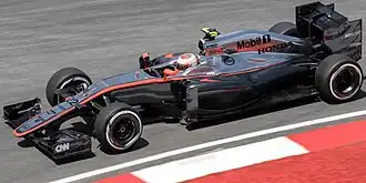 Button scored the car's first points in Monaco, with an eighth-place finish. He later attributed the result to having confidence in the car, noting that he could raise the ride height at the front end of the car and brake heavily without locking the brakes or bottoming out and hitting the road, but without compromising the performance of the car when turning in to the apex of a corner.[72] However, in the following races in Canada and Austria, the team's struggles came to a head as they were forced to reduce the power output of the engine to levels that had not been used since Australia, and could not therefore provide a competitive package for the long straights and slow corners of the Circuit Gilles Villeneuve and Red Bull Ring. In addition, with their arrival in Austria, both Button and Alonso had used up their quota of engine components for the season, which combined with unscheduled gearbox changes, resulted in both drivers receiving twenty-five place grid penalties.[73][74][75][N 2] The team also introduced their first major aerodynamic updates for the season, replacing the snub nose of the original design with a squared-off front end similar to the designs of the Williams FW37 and Red Bull RB11. The rear of the floor was also revised, with a series of slots cut into the body in front of the rear wheels to change the air pressure flowing towards the diffuser.[77] The team only saw limited running as Alonso retired on the opening lap after a collision with Kimi Räikkönen, but they were able to assess the new design at a post-race test. After enduring four consecutive retirements, Alonso scored his first point of the season with a tenth-place finish in Great Britain.[78]