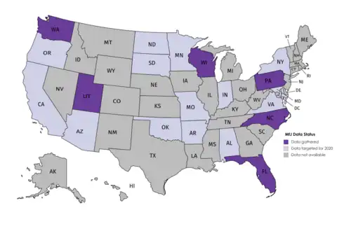The organization's data acquisition process begins with collecting data from U.S. statewide court datasets; often, these populate the majority of the measures. MFJ may also approach local agencies (prosecutors' offices, sheriffs' offices, public defenders' offices, etc.) to acquire supplemental data; this is done in writing or in person, via pairs of MFJ researchers who travel the states county by county.