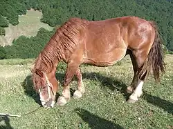 The notion of "meat horse" is a French specificity:[1] this term designates a livestock animal, the horse raised for the production of meat. Rural historian Marcel Mavré analyzes it as a degradation of the draft horse, the meat horse being a direct descendant of the draft horse, which is a working animal.[2] The development/evolution of the meat horse is very similar to that of beef cattle, since draft cattle are used as beef cattle.
