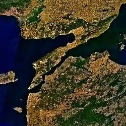 - On the northeast: A line joining Kum Kale (26°11′E) and Cape Helles, the western entrance to the Dardanelles