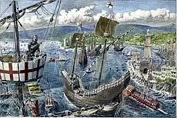 The Crusades led to the flourishing of trade between Europe and the outremer region.[30] Genoa, Venice and Pisa created colonies in regions controlled by the Crusaders and came to control the trade with the Orient. These colonies also allowed them to trade with the Eastern world. Though the fall of the Crusader states and attempts at banning of trade relations with Muslim states by the Popes temporarily disrupted the trade with the Orient, it however continued.[31] Europe started to revive, however, when there was gradual centralization of state power in the Renaissance of the 12th century.[32]