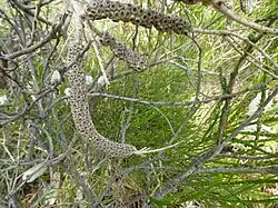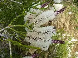 The flowers are white, cream-coloured or a shade of pink and arranged in spikes on the ends of branches which continue to grow after flowering and sometimes also in the upper leaf axils. The spikes are up to 100 mm (4 in) long and sometimes longer, up to 25 mm (1 in) in diameter and contain up to 140 groups of flowers in threes. The petals are 1.5–3 mm (0.06–0.1 in) long and fall off as the flowers age. The stamens are arranged in bundles of five around the flower, with 6 to 13 stamens in each bundle. Flowering occurs between August and January and is followed by fruit which are woody, cup-shaped capsules 2.3–2.8 mm (0.09–0.1 in) long and wide in clusters along the stem.[2][3]
