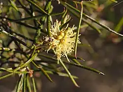 The flowers are yellow and are arranged in heads which are composed of 4 to 9 groups of flowers in threes. The petals are 1.1–1.3 mm (0.04–0.05 in) long, circular to egg-shaped and fall off as the flower opens. There are five bundles of stamens around the flower, each with 4 to 9 stamens. Flowering occurs between August and November and is followed by fruit which are woody capsules, 3.8–8 mm (0.1–0.3 in) wide, about the same length as width. The capsules remain separate from each other (whereas in Melaleuca uncinata they tend to become compressed together so that they look like a single fruit).[2]