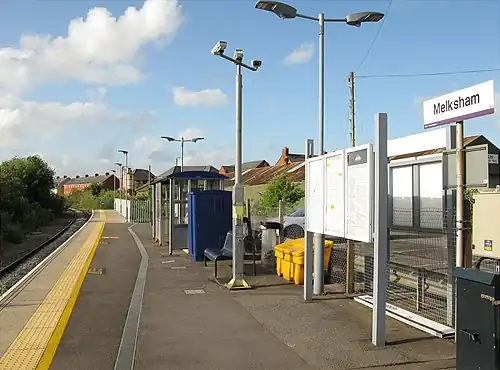 Melksham railway station, on the branch of the Wessex Main Line from Chippenham to Trowbridge, has services roughly every two hours in each direction on weekdays. Trains are operated by Great Western Railway, with services marketed as the 'TransWilts line' between Westbury and Swindon.[60]