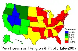 2007 Pew Forum on Religion & Public Life  Percentage of US adult population, by state, claiming Mormon as religious preference in the 2007 survey by the Pew Forum on Religion & Public Life.   The Pew Forum on Religion & Public Life  published a survey of 35,556 adults living in the United States that was conducted in 2007.[ 6]   The 2007 survey, conducted by Princeton Survey Research Associates International (PSRAI), found 1.7% of the U.S. adult population self identified themselves as Mormon.[ 7]   The table below lists a few significant findings, from the survey, about Mormons. Note: some less populated states were combined in this survey. These include: Montana-Wyoming, D.C.-Maryland, North & South Dakota, New Hampshire-Vermont, and Connecticut-Rhode Island. The racial and ethnic composition of the U.S. membership is predominantly white[ 8]   with a lower percentage of blacks when compared to the U.S. average.[ 9]