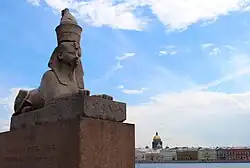 The artist-postmodernist Mikhail Shemyakin proclaimed in his work the principle of "metaphysical synthesis", which involved the creation of new forms and iconography based on the study of cult art from various countries and epochs.[13][14] "Metaphysical sphinxes" are reinterpreted images of their ancient Egyptian counterparts, installed on the University Embankment in St. Petersburg. In Ancient Egypt, such sculptures were part of the cult of the pharaoh, revered as a god and possessing unlimited power. At the same time, they were attributed mystical protective functions. Art historians see parallels between the sphinxes and Soviet Russia with its totalitarian dictatorship, cults of personalities like Lenin, Stalin, and Brezhnev, mass slave labor, and repression.[2][3][15][16]