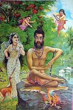 ![]() Menaka seduces Vishvamitra, painting by Raja Ravi Varma | |