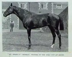After a brief spell to recover from the journey at Allison's Cobham Stud in Surrey, he was delivered to trainer Fred Webb in Newmarket.[20] Within two months on 7 April 1897 Merman had his first start in England in the Kingsclere Handicap at Kempton Park finishing fifth as the topweight.[21] His next start on 3 July 1897 was in the Duchess of York Stakes over a mile at Hurst Park. Merman still unsettled delayed the start of the race which affected his performance when he finished seventh in a field of nine to the American bred Diakka.[22] After an improved third at Leicester Racecourse in the handicap[23] Merman won his first race in England at Lewes in the Lewes Handicap (11⁄2 miles) as a lightweight with 6 st. 12 lbs. winning by 1⁄2 length.[24]
