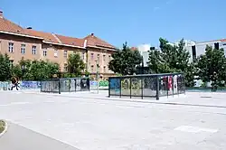 Metelkova is defined as a self-managed and well-organized community. There is no legal status for the site,[1] and its urbanism is informal.[9] For example, residents of Metelkova initially illegally siphoned water from Ljubljana. However, today Metelkova is legally connected to the city's water system and power grid. Metelkova is considered as a squat and there is not a clear position of political parties about the legitimacy of the cultural hub. This paradox around Metelkova makes it difficult to imagine future decisions, especially because military brownfields are good places for urban densification and rehabilitation through urban planning. Besides, some associations that defend feminism and LGBT communities are located in Metelkova, resulting in some attacks from neo-Nazi and skinhead groups.[13] Those attempts of extremist groups add up to the uncertain future of Metelkova.