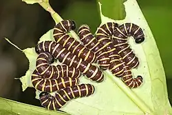 To develop from an egg to an adult, it takes M. confusa about 45 days.[6] The white eggs are found in clusters on the bottom side of Brunfelsia (Solanaceae). Some species of Methona could be monophagous.[5] M. confusa and M. curvifascia have similar larval appearances. M. confusa has 12 stripes on the body while M. curvifascia has 11.[5] M. confusa as an instar has dark brown and yellow stripes transversely across the body. As a pupa, it has a black cremaster and the wing pads have a black and gold color a couple days before emerging as an adult.[5] This pupa stage lasts around 12 days.[5]