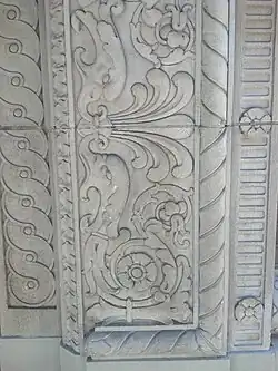 The front of the building uses materials of contrasting colors consisting of common bond red brick walls, cream-colored terra cotta details, black iron railings, and a red tile roof. The arched entry way has a rectangular frame with marble spandrels and spans the first and second stories. The third story has corbelled balconies in front of each window. The fourth floor has a pair of terra cotta escutcheons with the original WAC logo. The fifth and sixth floors have a two-story colonnade in front of a loggia. The other three sides of the building are relatively plain.[4]