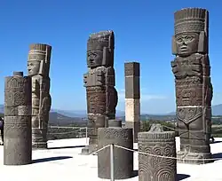 The modern archaeological site consists of the ceremonial center of Tula Grande, an area called Tula Chico, the Jorge R. Acosta site museum, and the Guadalupe Mastache orientation center.[33] The ceremonial center of the city is located on a limestone outcropping, with steep banks on three sides, making it defensible.[34] War and sacrifice are prominent themes at the site, with images representing warriors such as jaguars and coyotes, as well as eagles eating human hearts. There are also images of serpents eating skeletal figures and skulls in various areas.[32][34] The major attraction of the site is Pyramid B, also called the Pyramid of Quetzalcoatl or of the Morning Star. It is a five-tiered structure similar to the Temple of the Warriors at Chichen Itza. At the top of Pyramid B are four massive columns, each carved in the likeness of Toltec warriors which once supported the roof of the temple on top of the pyramid. Each warrior figure is of basalt, 4 metres (13 ft) high, with an atlatl or spear thrower, incense, a butterfly-shaped chest plate, and a back plate in the shape of a solar disk.[34]