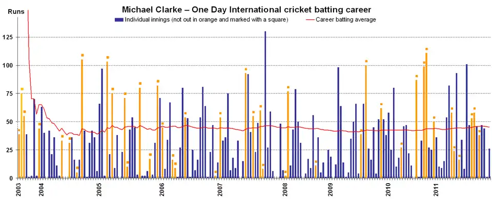 Clarke announced that he would retire from One Day Cricket at the conclusion of the 2015 Cricket World Cup.[82][83] Clarke played 244 ODIs, made 7907 runs at an average of 44.42 with 8 centuries and 58 half-centuries. He led his country in 73 matches, of which Australia won 49.[84]