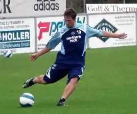 Owen began light training on 12 February 2007, when pictures on the club's official website highlighted Owen running and carrying out minor exercises.[81] He made his comeback from injury on 10 April 2007 in a 4–1 behind-closed-doors friendly against Gretna, scoring after ten minutes and then setting up fellow striker Shola Ameobi before coming off an hour later.[82] Owen then started his first game for Newcastle in over a year, a 1–0 loss against Reading on 30 April 2007. He played the full 90 minutes, having a goal disallowed for offside.[83] Owen was stretchered off an hour into Newcastle's game with Watford on 13 May 2007, suffering concussion after colliding with teammate Matty Pattison.[84] On 9 May 2007, Newcastle chairman Freddy Shepherd reacted angrily to reports that Owen could move on to another club at the end of the 2006–07 season due to a release clause in his contract. A report in The Times newspaper suggested Owen could be available for less than £10 million and could be a target for the likes of Chelsea, Manchester United, Liverpool and Arsenal. Despite these reports, Shepherd warned Owen "to show some loyalty" and warned him that "none of the big four clubs want him".[85] In a video posted on YouTube, however, a group of Liverpool fans asked Shepherd if they could re-sign Owen, he responded by saying that he would "carry Owen back to Liverpool" himself.[86] Shepherd also stated his dislike of Owen's agent but praised Owen as a "good lad".[87] This led many to believe that Owen would exercise his right to leave if the £9 million valuation was matched.[86] On 10 June 2007, Owen's new manager at Newcastle, Sam Allardyce, confirmed the existence of the release clause in Owen's contract and said he feared that the club would be powerless to prevent Owen from leaving.[88] On 12 July 2007, however, Owen committed his immediate future to Newcastle, stating, "I believe that these can be good times to be at Newcastle, which is why I am more than happy to be here."[89]
