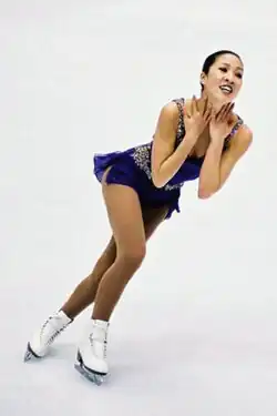 In the 1996–97 season, Kwan skated to "Dream of Desdemona" (short program) and "Taj Mahal" (free skate). During this season, Kwan struggled with her jumps because of a growth spurt, which affected her balance on her jump, and problems with new skating boots which she wore for an endorsement contract with the manufacturer.[28][29] She won the short program at the 1997 U.S. Nationals, but fell early in her free skate and as she later stated, "panicked" and made several more errors. She lost to Tara Lipinski, who came in first place in her free skate. Three weeks later, at the Champion Series Final, she again lost to Lipinski, who completed more successful jumps than Kwan in both the short program and free skate.[28] At the 1997 World Championships, Kwan came in second place, behind Lipinski, who won the gold medal. Kwan came in fourth place in her short program due to an unsuccessful jump combination while Lipinski came in first place and Irina Slutskaya, who missed her combination jump, came in sixth place. All three skaters performed well during their free skates, each earning first-place ordinals from three of the nine judges. Kwan won the free skate, with Lipinski coming in second place and Slutskaya coming in third place. Kwan's jumps in her free skate were not as difficult as Lipinski and Slutskaya's, but her skating between her jumps was more complex and demonstrated "more polished refinement".[30] Overall, Lipinski came in first place, Kwan came in second place, and Slutskaya came in fourth place behind Vanessa Gusmeroli of France.[31]