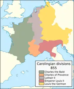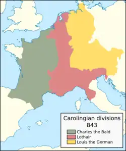 A three-year civil war followed his death. By the Treaty of Verdun (843), a kingdom between the Rhine and Rhone rivers was created for Lothair to go with his lands in Italy, and his imperial title was recognised. Louis the German controlled Bavaria and the eastern lands in modern-day Germany. Charles the Bald received the western Frankish lands, comprising most of modern-day France.[114] Charlemagne's grandsons and great-grandsons divided their kingdoms between their descendants, eventually causing all internal cohesion to be lost.[115][M] In 987, the Carolingian dynasty was replaced in the western lands, with the crowning of Hugh Capet (r. 987–996) as king.[N][O] In the eastern lands, the dynasty had died out earlier, in 911, with the death of Louis the Child,[118] and the selection of the unrelated Conrad I (r. 911–918) as king.[119]