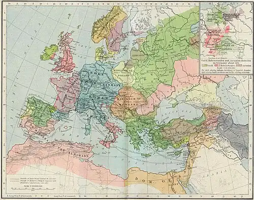 Efforts by local kings to fight the invaders led to the formation of new political entities. In Anglo-Saxon England, King Alfred the Great (r. 871–899) came to an agreement with the Viking invaders in the late 9th century, resulting in Danish settlements in Northumbria, Mercia, and parts of East Anglia.[124] By the middle of the 10th century, Alfred's successors had conquered Northumbria and restored English control over most of the southern part of Great Britain.[125] In northern Britain, Kenneth MacAlpin (d. c. 860) united the Picts and the Scots into the Kingdom of Alba.[126] In the early 10th century, the Ottonian dynasty had established itself in Germany, and was engaged in driving back the Magyars. Its efforts culminated in the coronation in 962 of Otto I (r. 936–973) as Holy Roman Emperor.[127] In 972, he secured recognition of his title by the Byzantine Empire, which he sealed with the marriage of his son Otto II (r. 967–983) to Theophanu (d. 991), daughter of an earlier Byzantine Emperor Romanos II (r. 959–963).[128] By the late 10th century Italy had been drawn into the Ottonian sphere after a period of instability;[129] Otto III (r. 996–1002) spent much of his later reign in the kingdom.[130] The western Frankish kingdom was more fragmented, and although kings remained nominally in charge, much of the political power devolved to the local lords.[131]