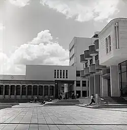 In its early days, Middle East Technical University, initially heavily criticized due to its humble facilities resembling a middle school building, quickly embarked on efforts to establish its own campus.[23] Although the campus location had not been finalized, a plan proposed by G. Holmes Perkins was accepted.[24] Amid considerations to use either the lands behind Yalıncak Village or the buildings of the Etimesgut Sugar Factory for the campus site, the government pressed for immediate foundation laying. Consequently, a groundbreaking ceremony was held in Yalıncak Village on October 2, 1957, attended by nearly all ambassadors in Ankara, then-President Celal Bayar, Prime Minister Adnan Menderes, and other ministers.[24][25] The first chairman of the METU Board of Trustees, Vecdi Diker, had brought an excavator from the General Directorate of Highways to commence the digging.[26] At the start of the 1957–1958 academic year, the Faculty of Architecture, the Faculty of Engineering, and the Faculty of Administrative Sciences were established. In 1959, the establishment of the Faculty of Arts and Sciences was completed.[18] Within the framework of Perkins’ campus plan, the first building designated was the Faculty of Administrative Sciences, and in 1959, a Turkish team comprising Dr. Turgut Cansever, Ertürk Yener, and Mehmet Tataroğlu won an international design competition for it.[27] However, the project was put on hold as the campus location was still not definitively established.