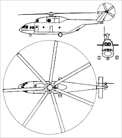 The Mi-46T was the passenger/cargo transport version, built similar to the Mil Mi-26, with a takeoff weight just half the weight of the Mi-26, fit to replace the aging Mi-6.[2] The Mi-46T requires two new-type Aviadvigatel turboshaft engines, each with a power of 5,590 kW,