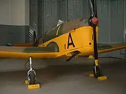 The Magister is largely built of wood, the fuselage consisting of a spruce structure with a plywood covering; similar materials were used for the three-piece wing and the tail unit.[5][7] The wing centre section has no dihedral and is of constant section with outer sections having dihedral and tapering towards the tip.[8] It has split flaps as standard; it was the first RAF trainer to have flaps.[9][10][7] It has a fixed tailwheel undercarriage with drag-reducing spats on the main wheels; to reduce the landing distance, the undercarriage was fitted with Bendix drum brakes.[8][7] Power is provided by a 130 hp de Havilland Gipsy Major engine and the fuel is contained in a pair of tanks in the centre section.[7]