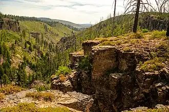 A mix of conifer tree species account for approximately 84% of the forested area of Mill Creek Wilderness. The northwest corner plateau area, Bingham Prairie, is mostly forested with lodgepole pine, which have recently been attacked by the mountain pine beetle, causing some trees to die.[4] In August and September 2000, the Hash Rock Fire burned 14,236 acres (5,761 ha) of the Mill Creek Wilderness.[2] However, the area is quickly recovering and currently contains examples of an exemplary climax forest of ponderosa pine.[5] Other plants in Mill Creek Wilderness include aster (genus), bull thistle, snowberry, and both native and non-native species of grass.[7]