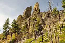 Mill Creek Wilderness consists of towering stone pinnacles, steep canyons, barren ridge tops, and high elevation meadows. A unique feature of this wilderness is the pair of volcanic plugs called Twin Pillars.[1][4] The northwest corner of the Wilderness is Bingham Prairie, an almost flat plateau with open meadows and a lodgepole pine forest.[5] Mill Creek drains approximately 85% of the Wilderness, with Marks Creek drainage accounting for the difference. Both creeks are tributaries of Ochoco Creek.[5]