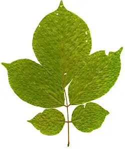 The leaves have two or three pairs of leaflets and one terminal leaflet which is largest.[2] Leaflets have 9 to 11 pairs of lateral, parallel veins. The purple-blue flowers are carried on racemes which appear in spring.[2]